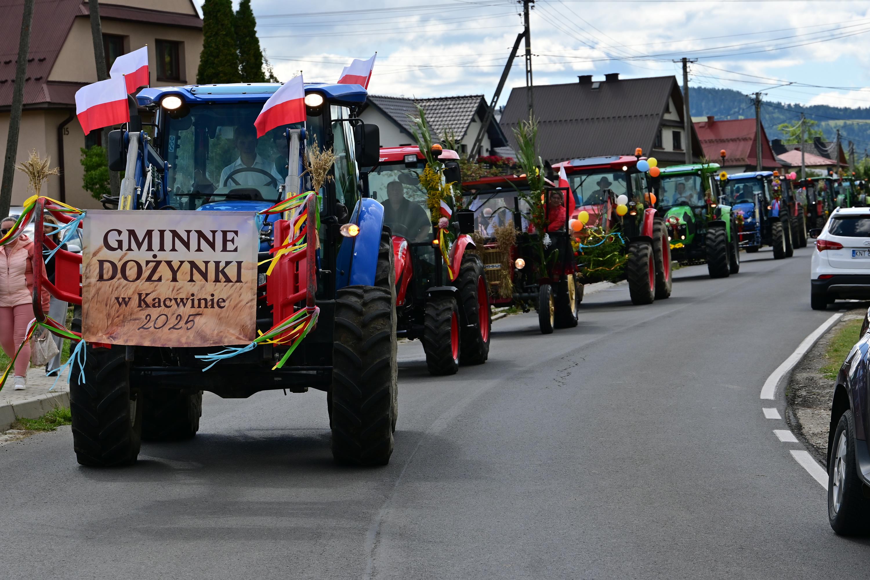 Rolnicy i gospodarze z Kacwina otworzyli dożynki barwnym korowodem traktorów, pięknie przystrojonych, po którym w amfiteatrze na boisku sportowym odbyła się dziękczynna msza święta, w której uczestniczyli zebrani mieszkańcy Gminy Łapsze Niżne, poczty sztandarowe OSP, poczet sztandarowy  Kruszgeo oraz  goście i turyści, by wspólnie podziękować za tegoroczne plony.